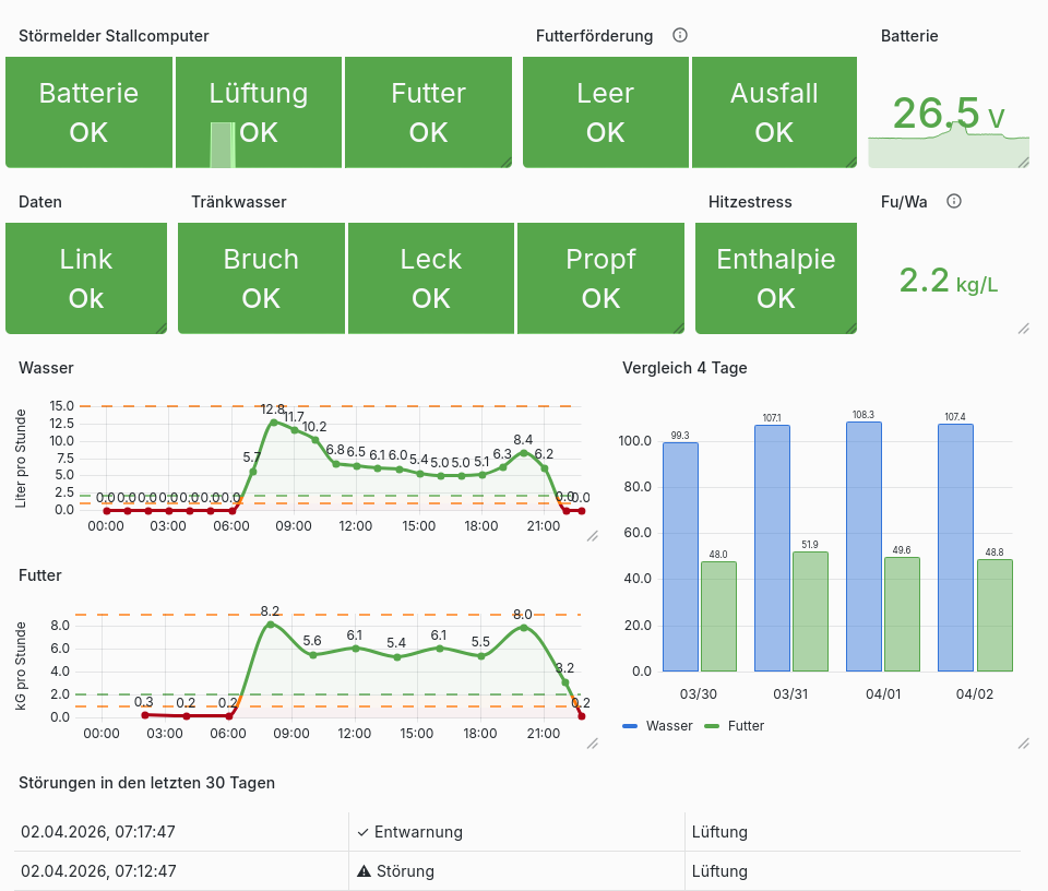 Ein Problem in der Tränkeleitung, die Futterkette läuft leer, die Lüftung versagt. Die Kühleinrichtung taut auf oder man hat wieder vergessen, den Datenlogger auszulesen. Rückgang der Legeleistung und erhöhte Tierverluste sind vermeidbare teure Folgen. Die Kontrolleure von Behörden und Qualitätssicherung kann man nun mit jederzeit abrufbaren Aufzeichnungen erfreuen.